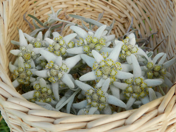 Hoch über dem Tal, auf 1650 Metern Höhe, gedeihen die Edelweiss (Leontopodium alpinum) auf den sonnigen Terrassen des Guarda Kräutergartens. Umgeben von Ringelblumen, Salbei, Lavendel, Rosen und einer Vielzahl anderer Kräuter und Blumen pflegen wir die Pflanzen in liebevoller Handarbeit. Wenn die Edelweiss im Sommer in voller Blüte stehen, werden sie in sorgfältiger Handarbeit geerntet.