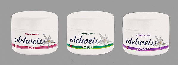 La Crème visage douce à l’huile de jojoba et aux extraits d’Edelweiss pour peaux particulièrement sensibles nature sans parfum ou parfumée à la lavande ou à la rose.